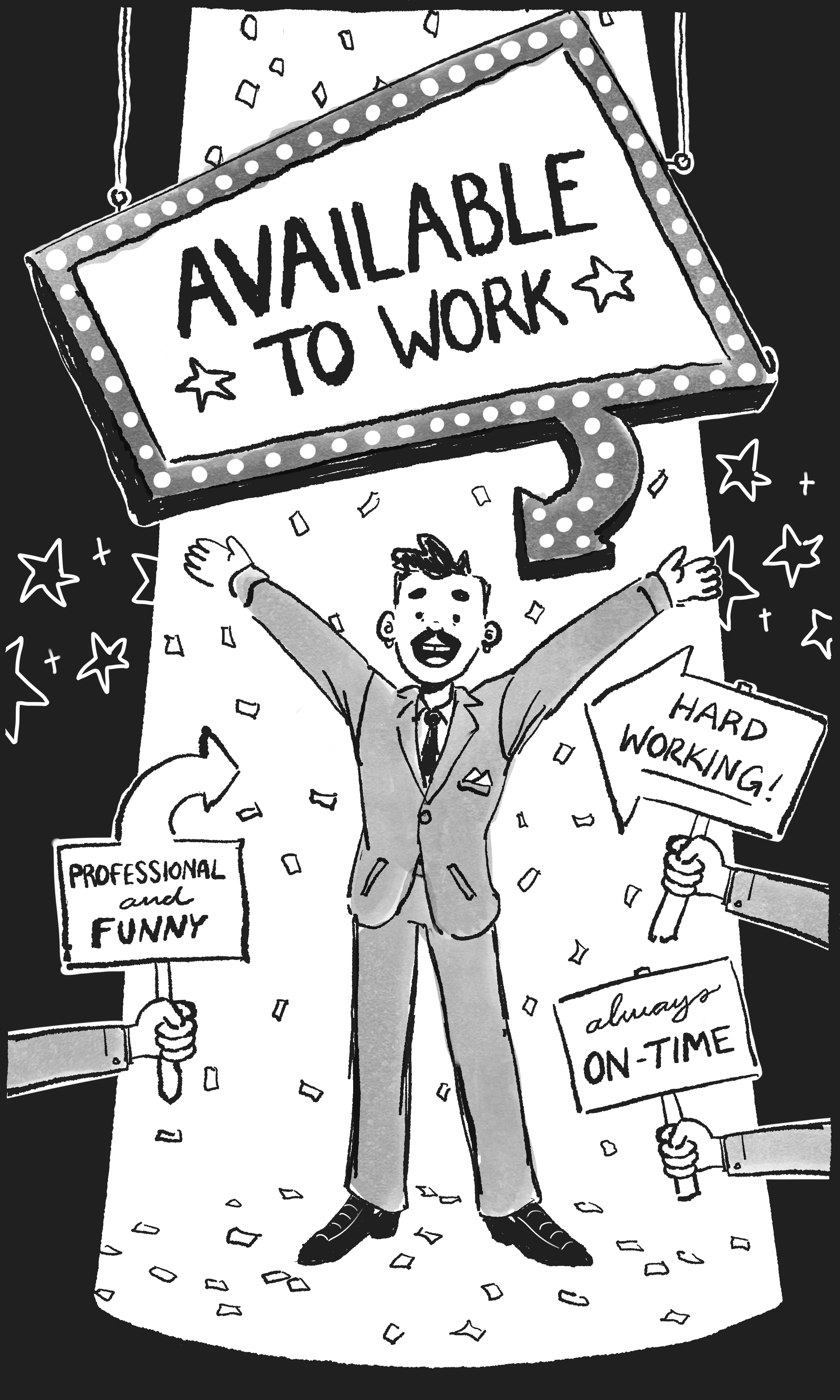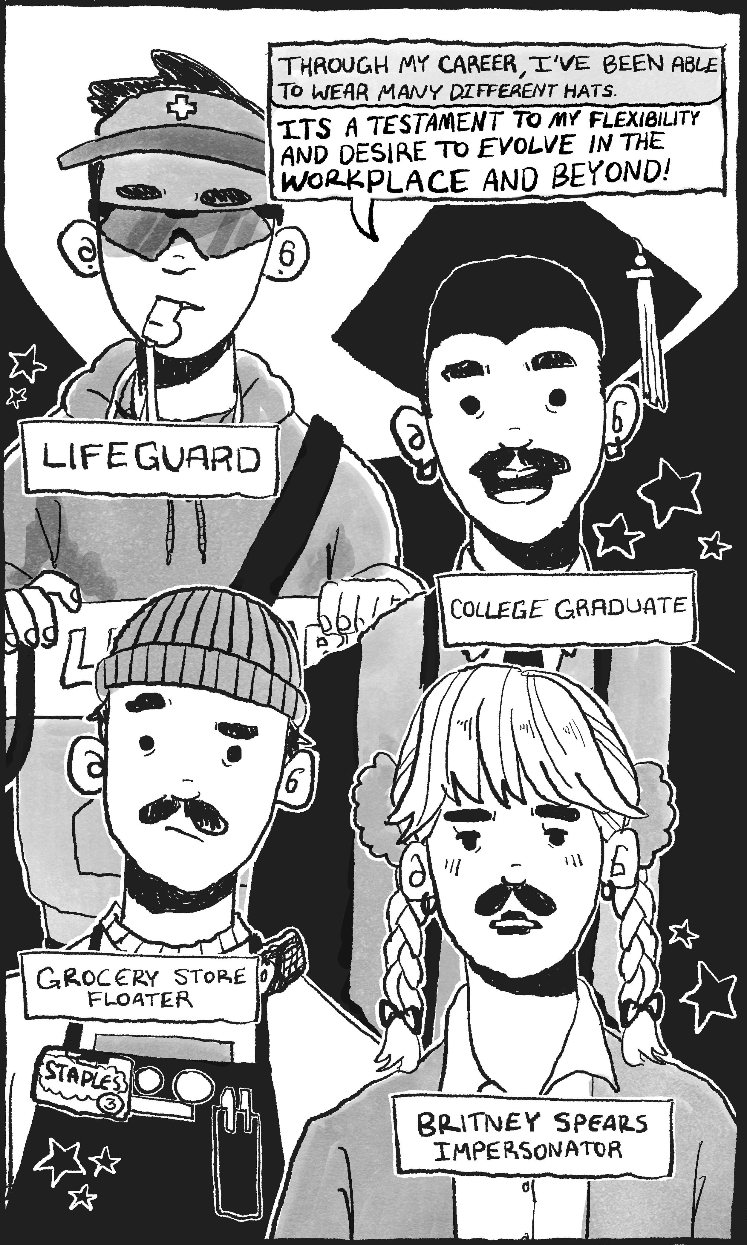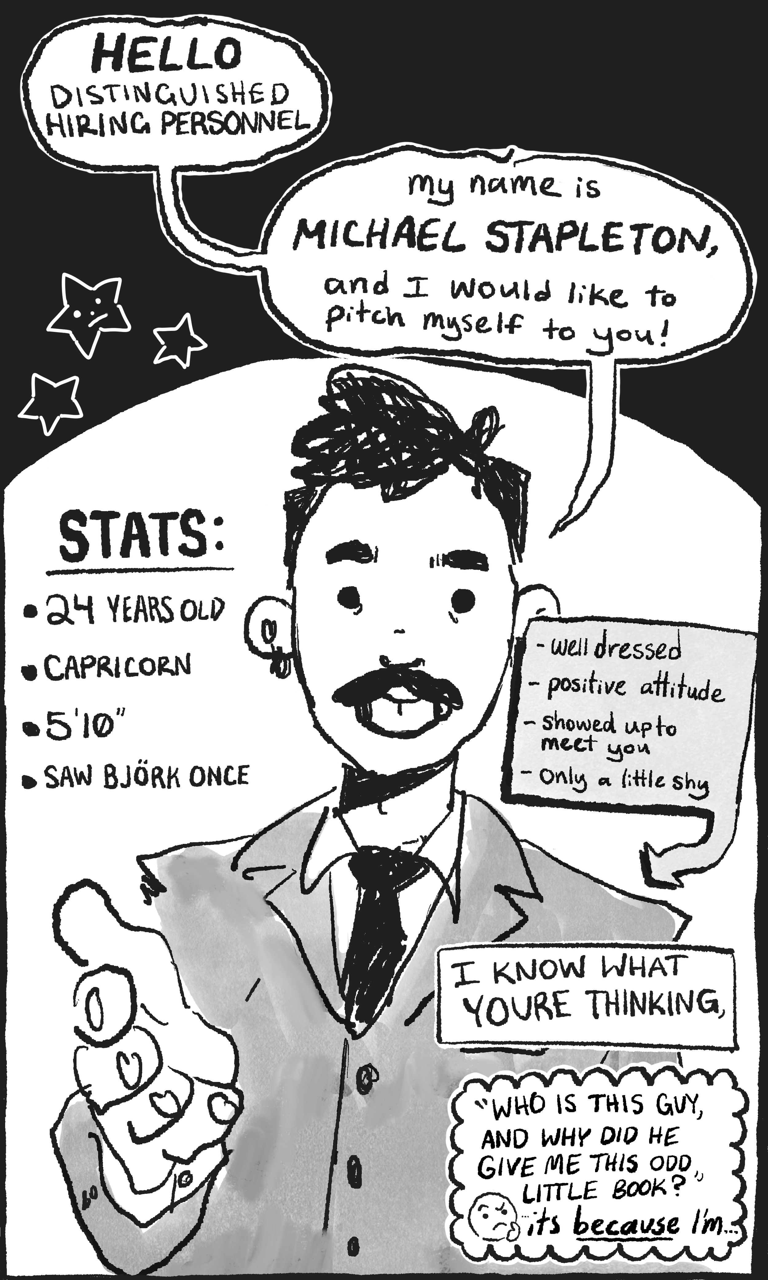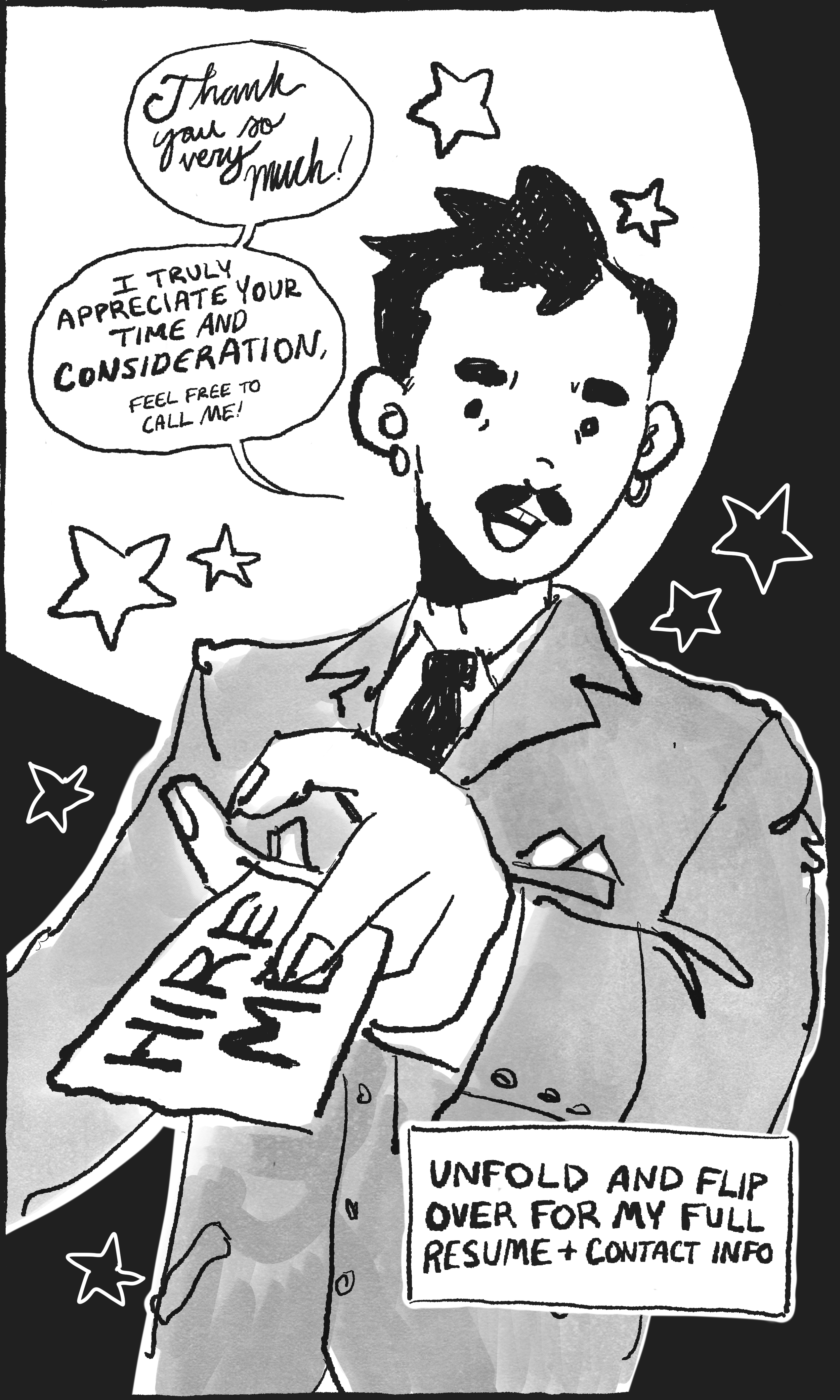 Weary of the traditional Cover Letter, I sought to create a compact zine to sell myself as a potential employee and as a demonstration of my abilities. The booklet features 6 fully illustrated panels, a complete resume on the reverse side, and a business card for good measure. It stands out against other resumes, and whether you think thats good or bad, I like to think the non traditional format makes it at least memorable.